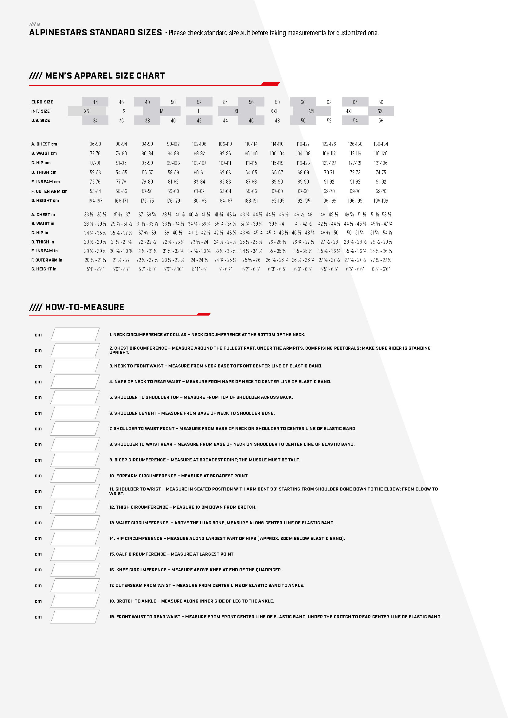 Weet je niet precies wat je maat is? Kijk in onze maattabellen en vind de juiste maat voor je racekleding. Deze tabel geeft je een duidelijk overzicht inzake de diverse merken die we in ons gamma aanbieden. Personen die iets bredere schouders hebben dan normaal, zijn soms genoodzaakt om een maat groter te nemen. Ben je niet zeker van de maatvoering? Aarzel dan zeker niet om met ons contact op te nemen, wij helpen je graag verder.